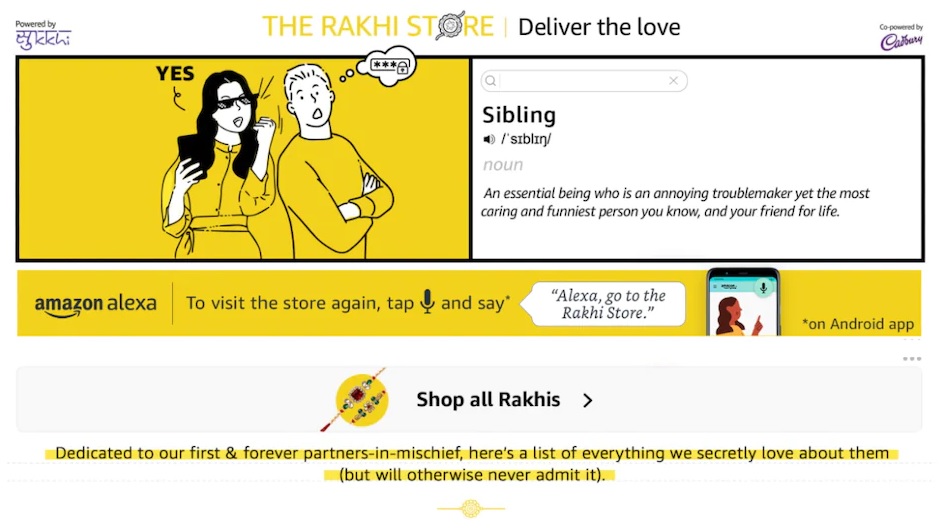 इसे राखी और फैशन, ब्यूटी, स्मार्टफोन, टीवी, होम डेकोर, किचन अप्लाएंसेस, चॉकलेट्स, एक्सेसरीज, पर्सनालाइज्ड गिफ्ट कार्ड्स व अन्य प्रोडक्ट्स के लिए ही डिजाइन किया गया है। रिपोर्ट के मुताबिक इस स्टोर पर ग्राहकों को रेडमी नोट 10 प्रो मैक्स और वनप्लस नॉर्ड एसई 5जी पर कई सारे ऑफर्स दिए जाएंगे। उपभोक्ता अमेजन शॉपिंग ऐप (केवल एंड्रॉयड) पर एलेक्सा से बोलकर भी ‘राखी स्टोर’ तक जा सकते हैं।